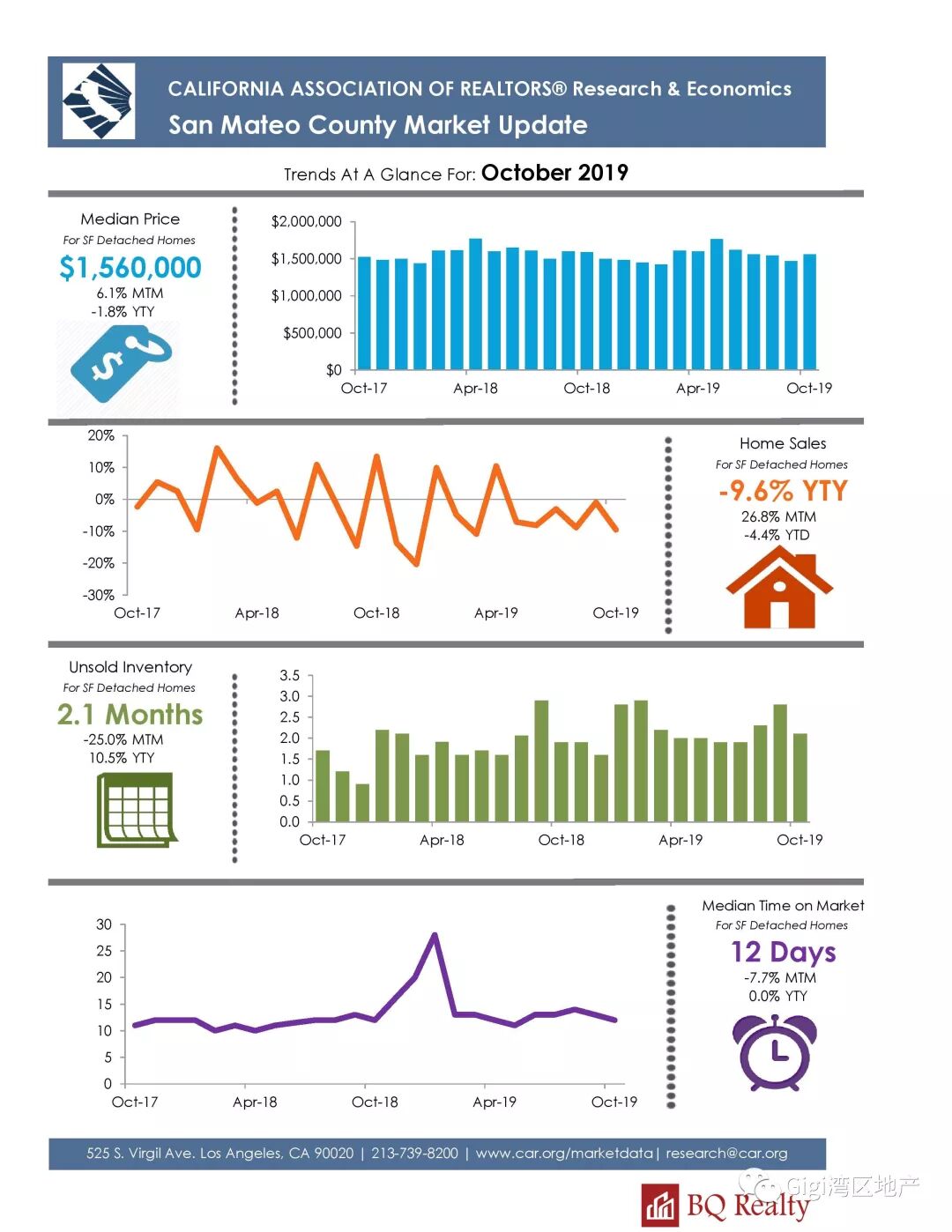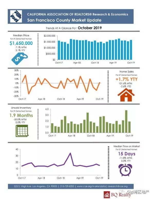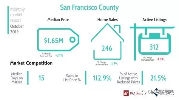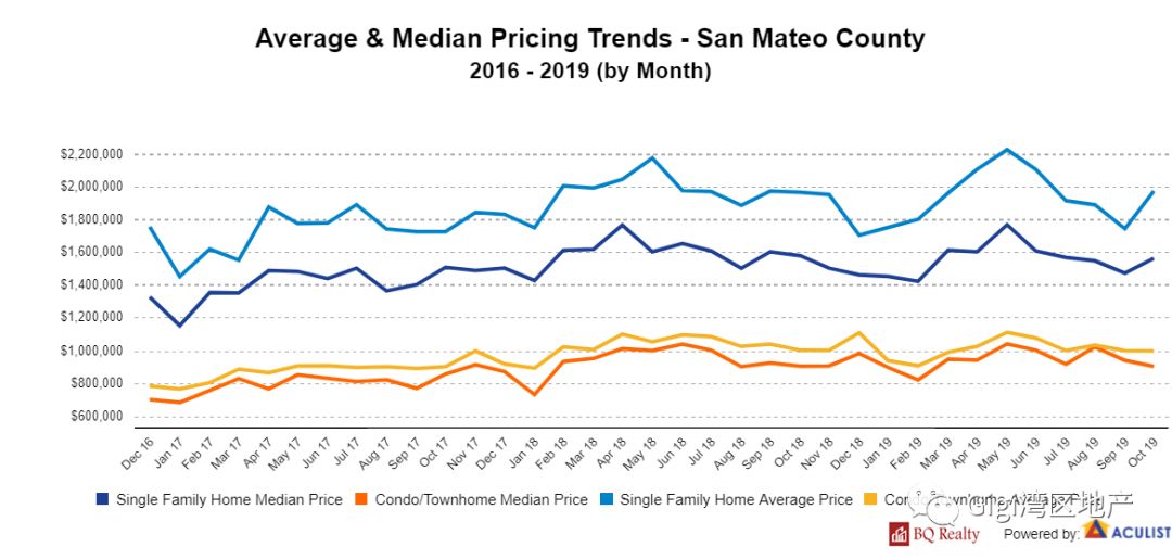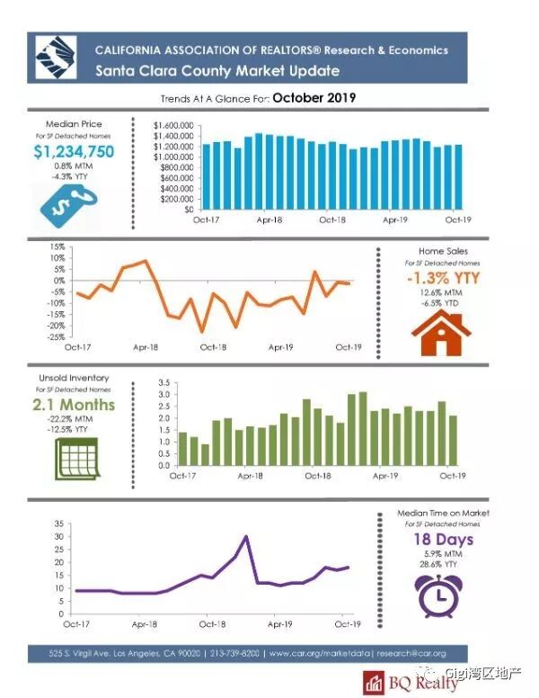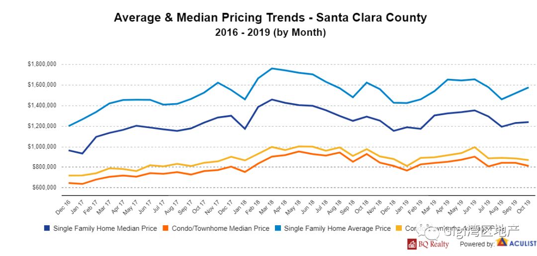 我们以Santa Clara County 为例,2019年10月份房屋供应量有所下降,成交量增加。成交价与要价持平。目前房地产市场有从卖方市场转向买方市场的趋势。