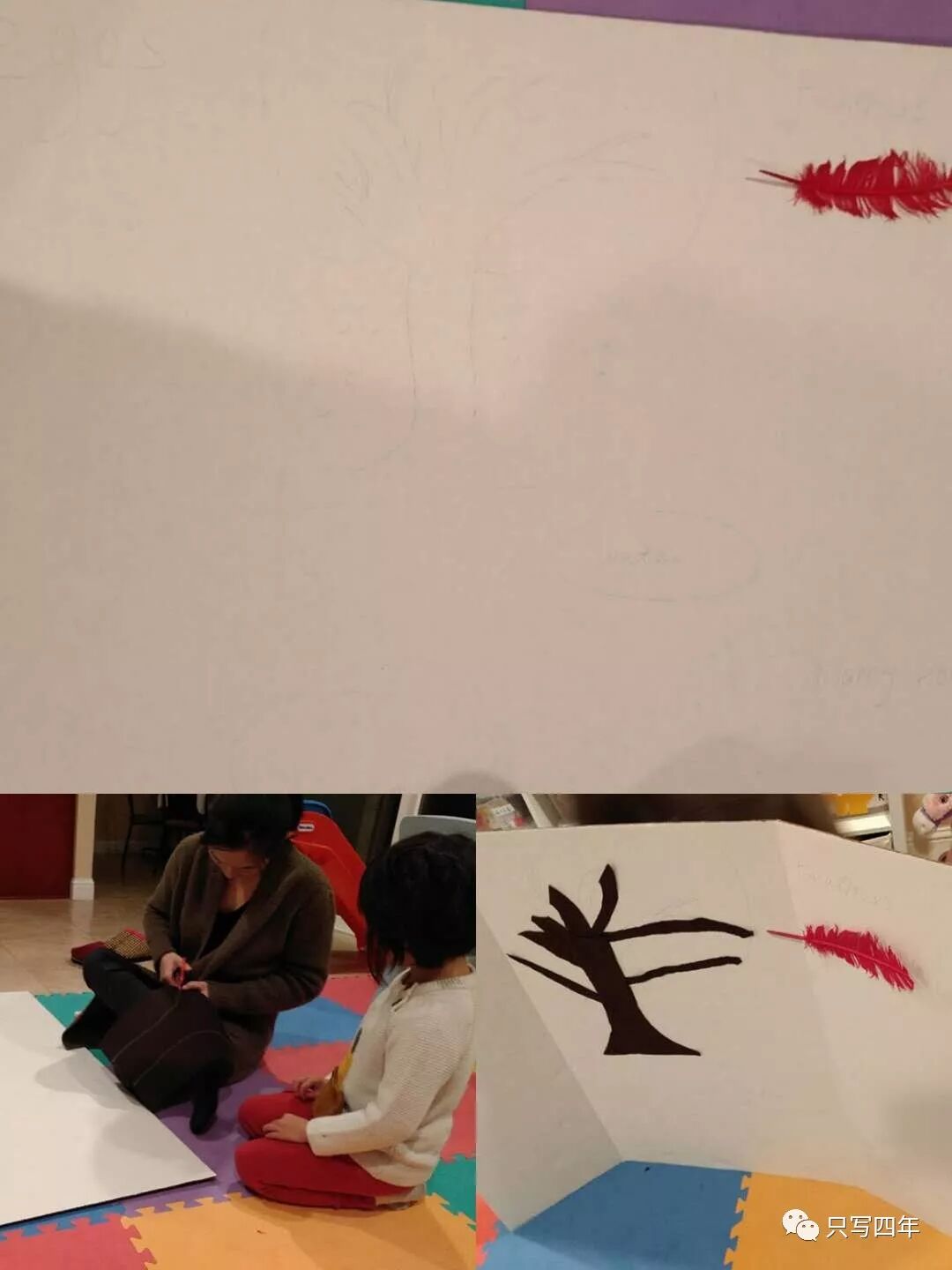 孩子迫不及待的把一片鲜红的羽毛放到了展示板上就要粘,可是项目的统一规划呢?于是我们三一起,根据要讨论的几个小主题开始规划整个展板的布局。商量好布局,爸爸开始用铅字勾画出每个模块的框架,我们才开始后续的工作。