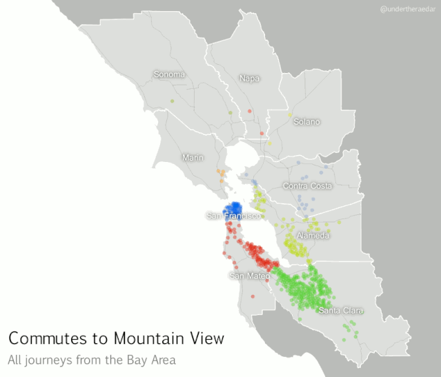 今天,我们仅选取湾区的5个zip code,来看看早高峰,这几个location去到Google Mountain View的路上时间。抛砖引玉,大家来讨论下学区房、通勤房的考量。