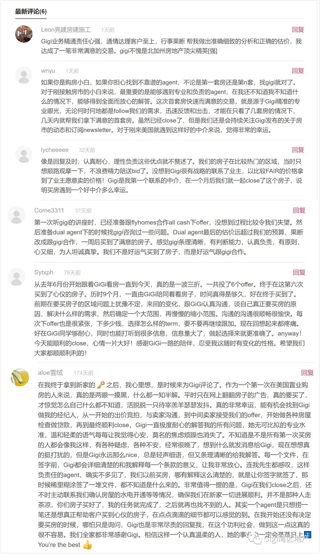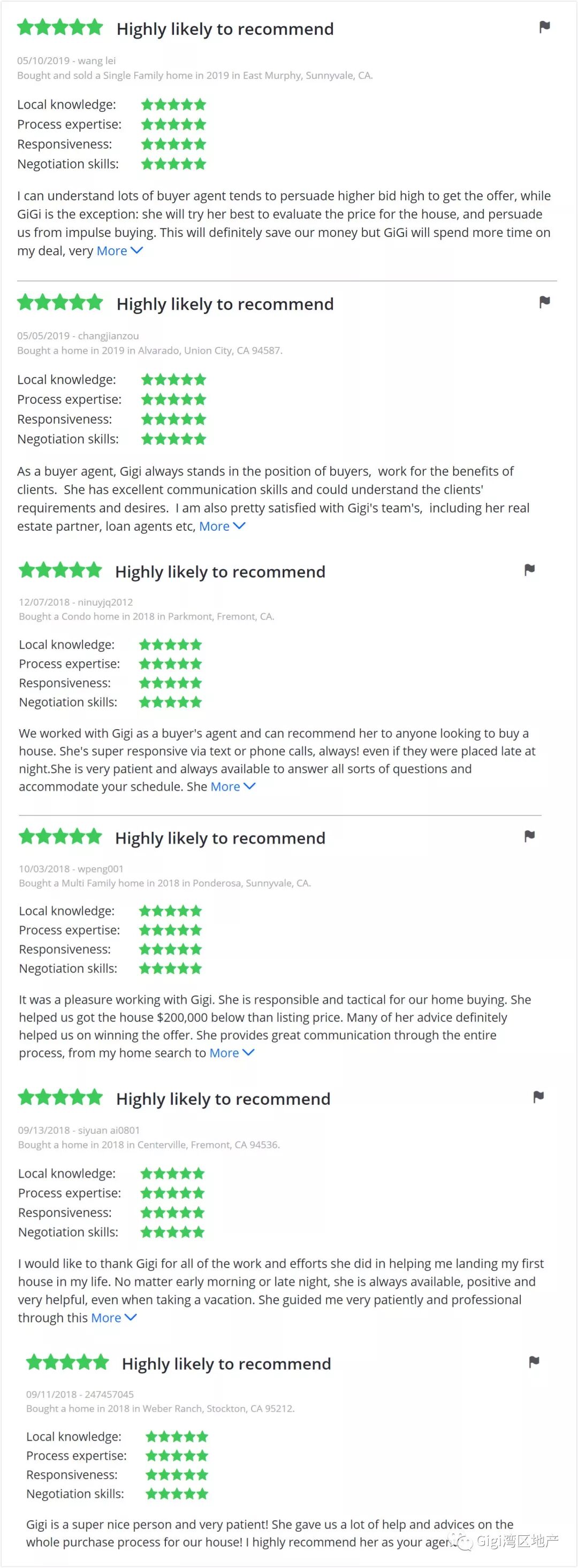 ● Zillow全五星Premier地产经纪。2018年,Gigi 占了所在公司仅6席的卓越成就奖。多次获得交易过程中卖家和卖家经纪人的好评。不论是沟通、合同的精准度和交易的完成度,行业的美誉度让其他经纪人更乐意和她合作,这也是Gigi能给客户带来更好第一手消息的来源。